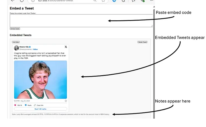 - For each embedded tweet, you can add a note (a form will appear when the “Add Note” button is clicked) or delete the tweet entirely.