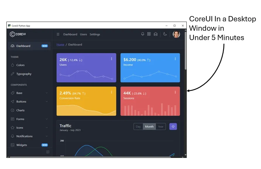 In the end, you’ll have a functional desktop application showcasing the CoreUI Bootstrap 5 dark theme within a PyWebView window.
