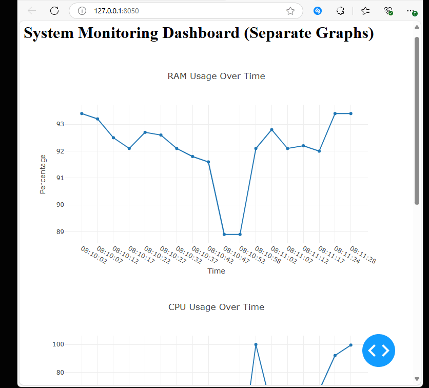 http://127.0.0.1:8050/You’ll see a dashboard that updates every 5 seconds, showing: