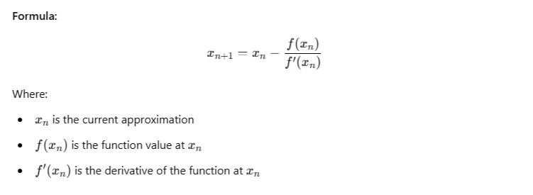 This function iterates using the Newton-Raphson formula. It keeps refining the guess until the function value is close to zero, indicating a root.