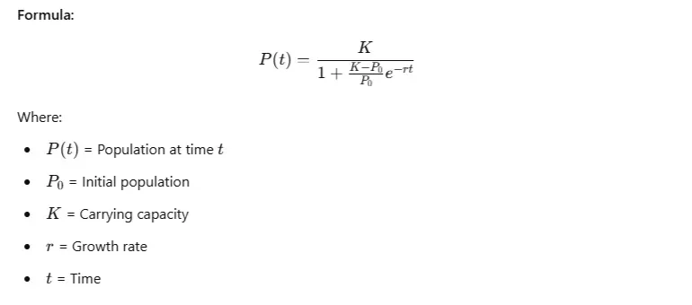 This function calculates the population using the logistic growth model. It shows how a limited environment constrains growth over time.