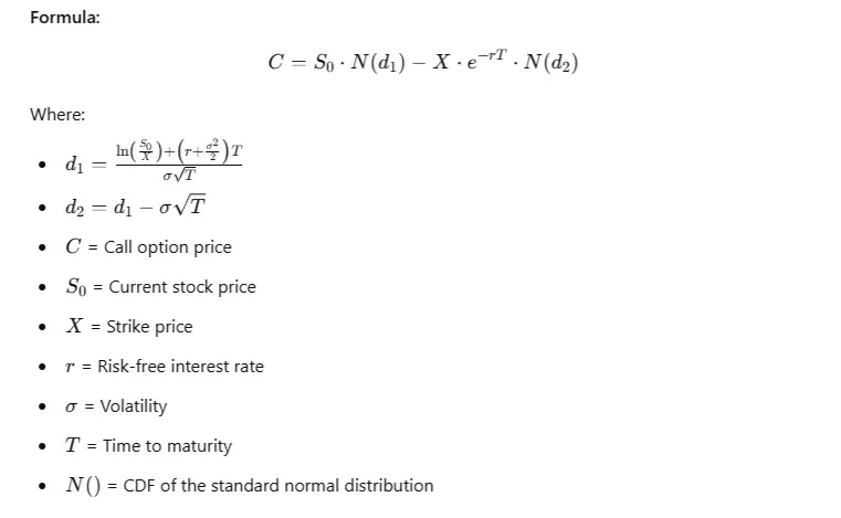The Black-Scholes formula is used in finance to determine the price of European call and put options. It involves several mathematical functions, including the cumulative distribution function (CDF) of the standard normal distribution.