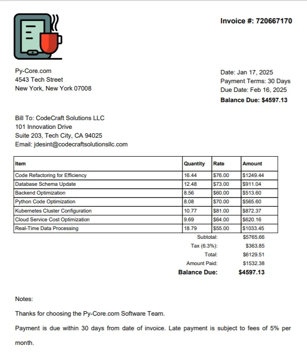 pdf.multi_cell(0, 10, "Thanks for choosing the Py-Core.com Software Team.\nPayment is due within 30 days from date of invoice. Late payment is subject to fees of 5% per month.")